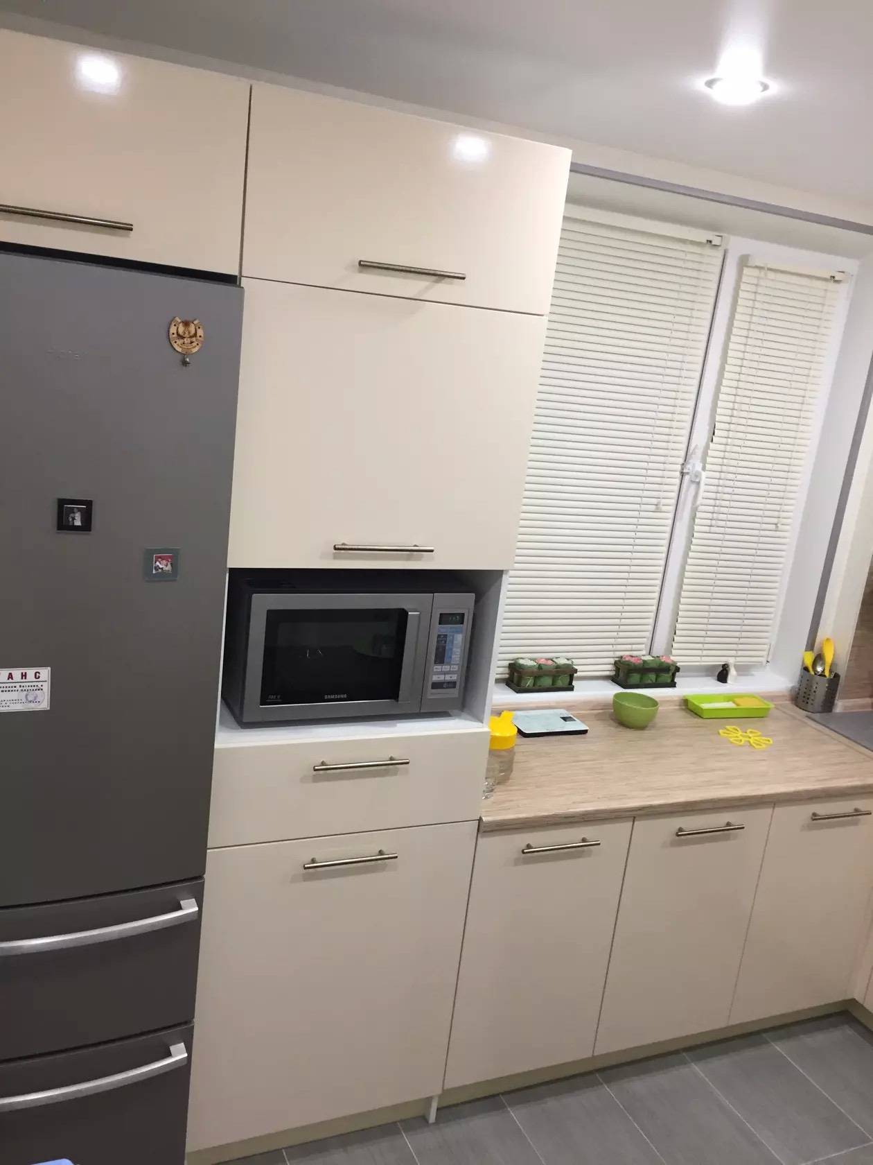 Если холодильник большой, а на кухне планируется обеденная зона, то его целесообразно убрать в коридор или примыкающую к кухне часть квартиры.