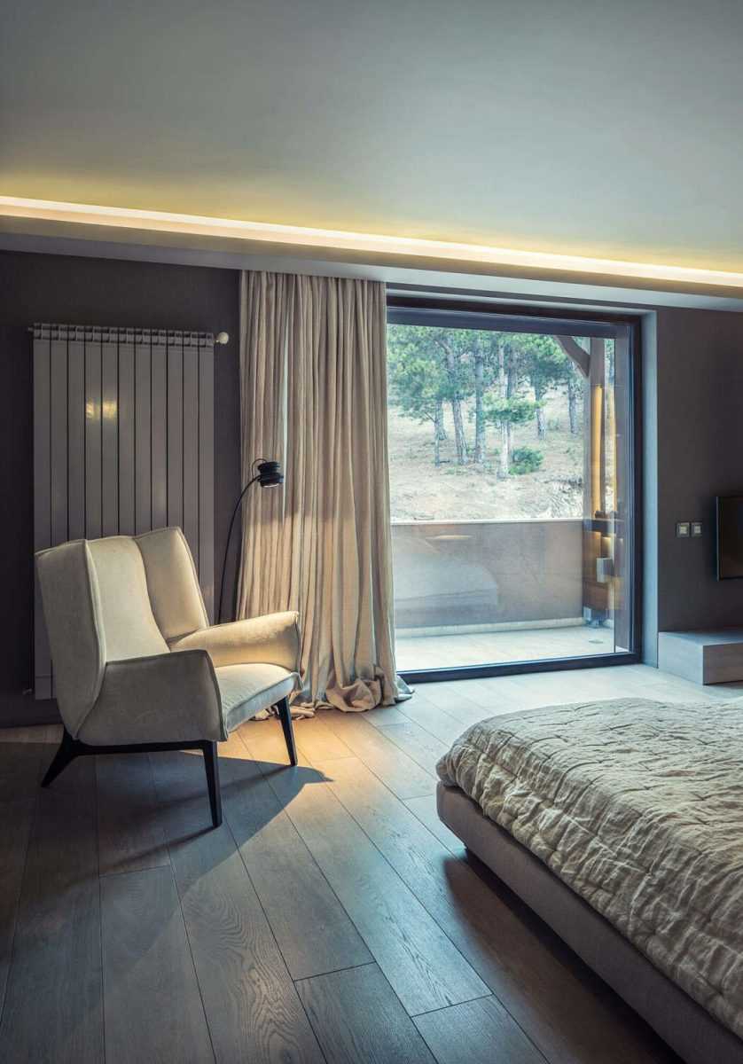 Классические гардины гармонично впишутся в интерьер спальни — невесомая органза и тяжелые портьеры для полноценного сна. В качестве альтернативы можно повесить римские шторы, дополненные кисеей.