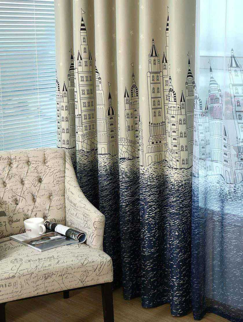 При этом, как правило, такие шторы выполнены из легких, полупрозрачных тканей. В основном это белая тюль с нанесенной на ней рисунком в постельных тонах. Чаще всего используются такие цвета как бирюзовый, голубой и кремовый.