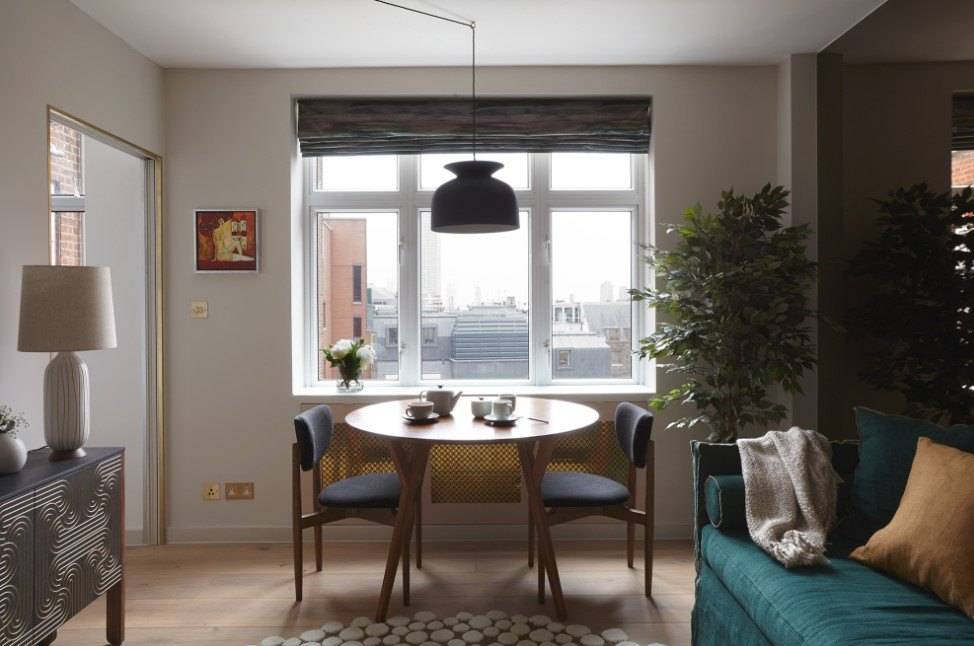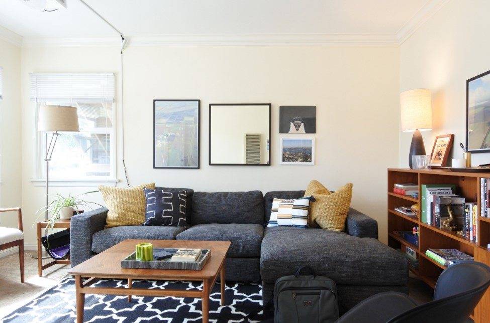 Совсем другой коленкор возникает, когда стоит задача разделить гостиную на зоны: в квадрате, особенно маленьком, допустимы исключительно визуальные приемы.
