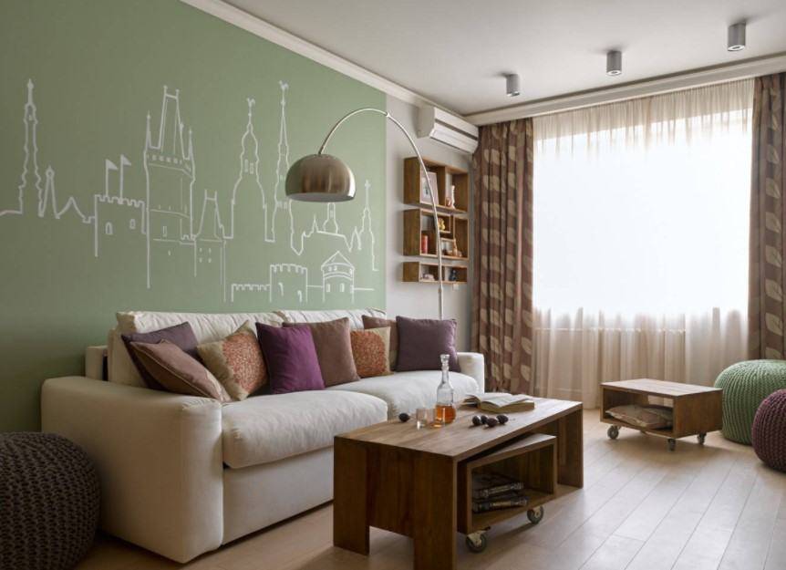 Просторные гостиные от 16 квадратных метров можно делить физическими перегородками, ширмами, шторами, мебелью (шкаф, стеллаж, диван), буквально разбивая одно вытянутое помещение на 2 квадратных.