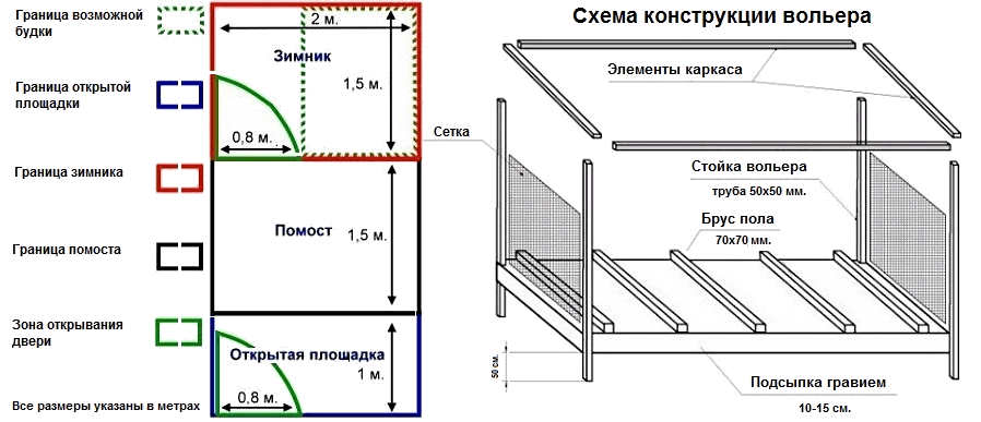 - Остальные параметры схожи с рассмотренными выше. Вольер должен иметь большую теплую будку, утепленный деревянный пол, уложенный на бетонное основание.