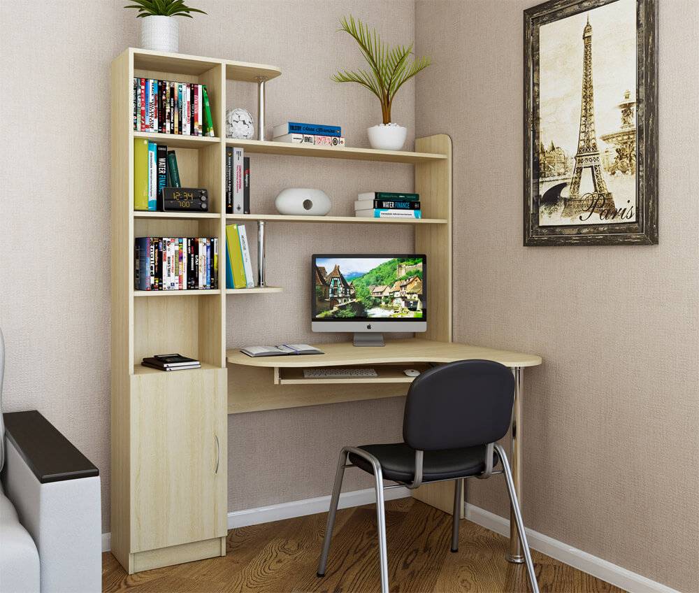 В продаже сегодня имеются различные варианты мебели для школьника. Стол может быть прямым или угловым. Выбор зависит от габаритов помещения, а также творческих предпочтений ребенка. Самым простым считается стол прямоугольной формы. Если не предполагается ставить на него компьютер, размер столешницы может быть небольшим. Однако следует предусмотреть достаточное количество шкафчиков и полочек.