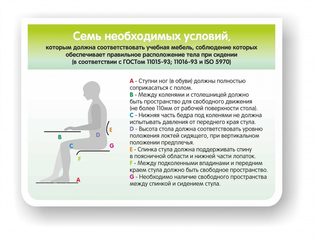Неправильно подобранные габариты стула могут спровоцировать боли в позвоночнике, ухудшение зрения, быструю усталость во время сидения на нем. Если ноги не достают до пола, передавливаются бедренные артерии, которые снабжают кровью нижние конечности. В результате у человека возникает онемение ног, а впоследствии – трудности при ходьбе. Слишком высоко установленное сиденье вызывает необходимость сидящего человека сутулиться, изгибать позвоночник так, чтобы приблизить глаза к столу.