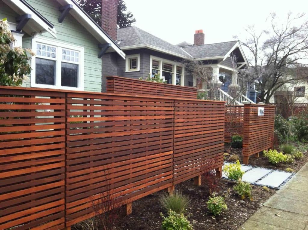 Ограждение из дерева, по внешнему виду напоминающее горизонтальные жалюзи, именуют лесенка. Существует два варианта исполнения — открытая конструкция и глухой забор.