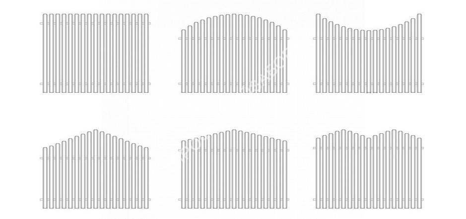 Есть еще несколько разновидностей заполнения пролетов (расстояния между опорными столбами). Проще всего в монтаже прямой способ — это когда все планки одной длины. Поверх такой ограды можно пустить П-образную планку из того же материала (продается там же где и евроштакетник). Кроме эстетической нагрузки, она еще прикрывает срезы металла, что увеличивает срок службы забора.