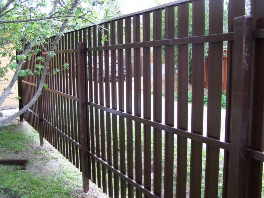 Ширина пролета вертикального забора из металлического штакетника — 200-250 см. Именно на таком расстоянии вкапывают столбы, затем между ними закрепляют две или три поперечины. Эти поперечины называют «лаги» или «тетивы». Для штакетника высотой до 150 см достаточно две поперечины, для более высоких лучше три.