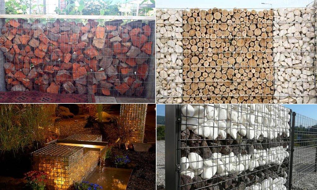 Традиционно в качестве наполнителя выступали гранитные булыжники, однако, сейчас разнообразие доступных материалов гораздо шире. В зависимости от дизайнерского замысла короба наполняются колотой горной породой, декоративным морским камнем или даже деревом. Для достижения особого декоративного эффекта наполнители разного цвета или формы комбинируются. Главное требование к наполнителю – достаточно крупная фракция, которая не будет высыпаться из сетки.