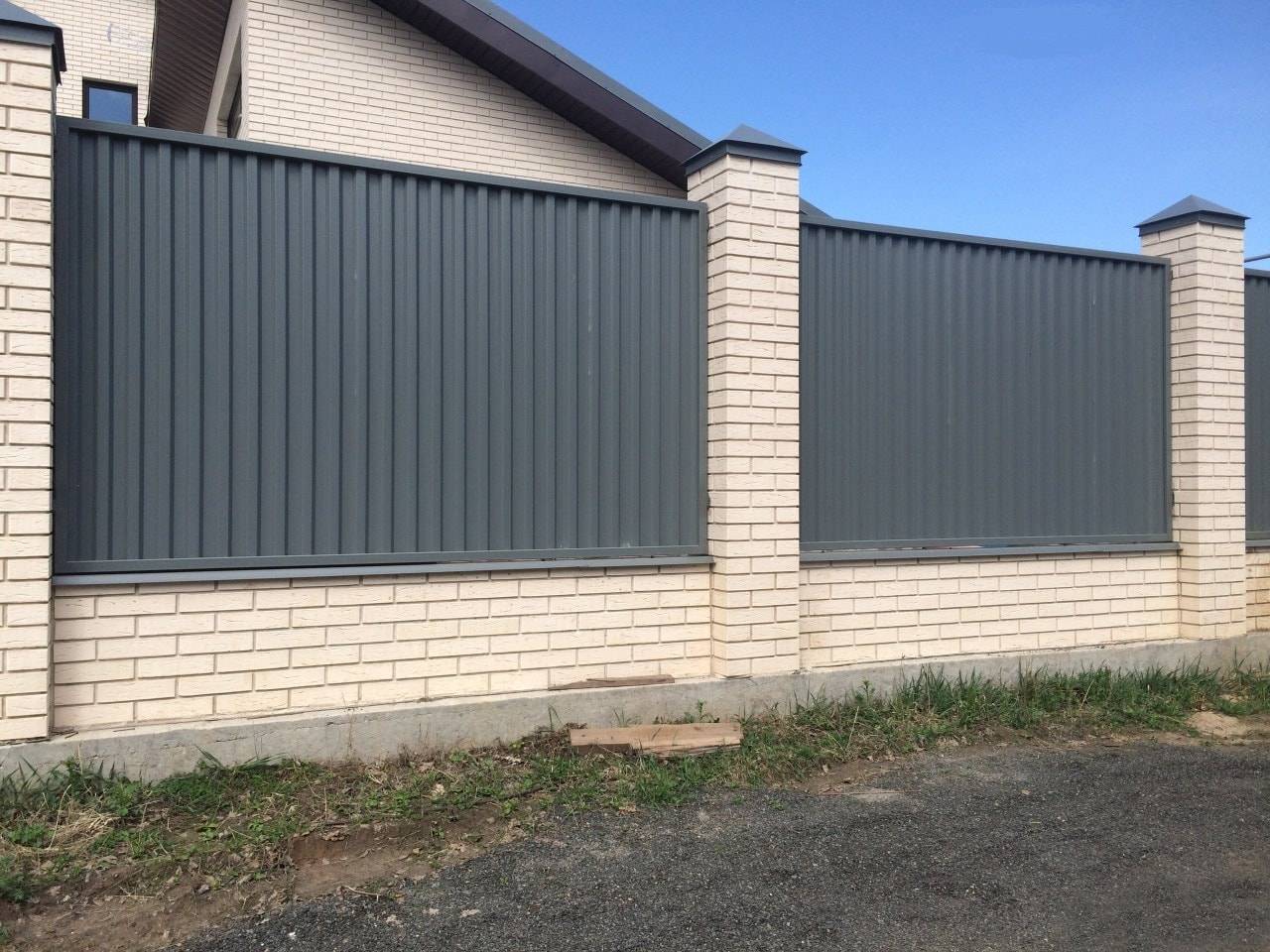Кирпичные заборы хороши тем, что прекрасно сочетаются с другими строительными материалами. Например, кирпичная кладка не обязательно должна быть монолитной, а может быть украшена вставками из кованных решеток, цветного профнастила или каменной секции.