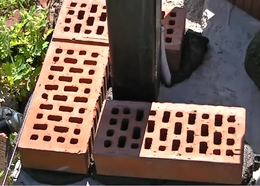 Кирпичный забор также устанавливается на прочном фундаменте, это обязательное условие для такой тяжелой конструкции. Фундамент лучше всего заливать бетоном, в котором уже установлены опоры для будущего ограждения. В виде опор лучше всего использовать металлические трубы круглые или квадратные.