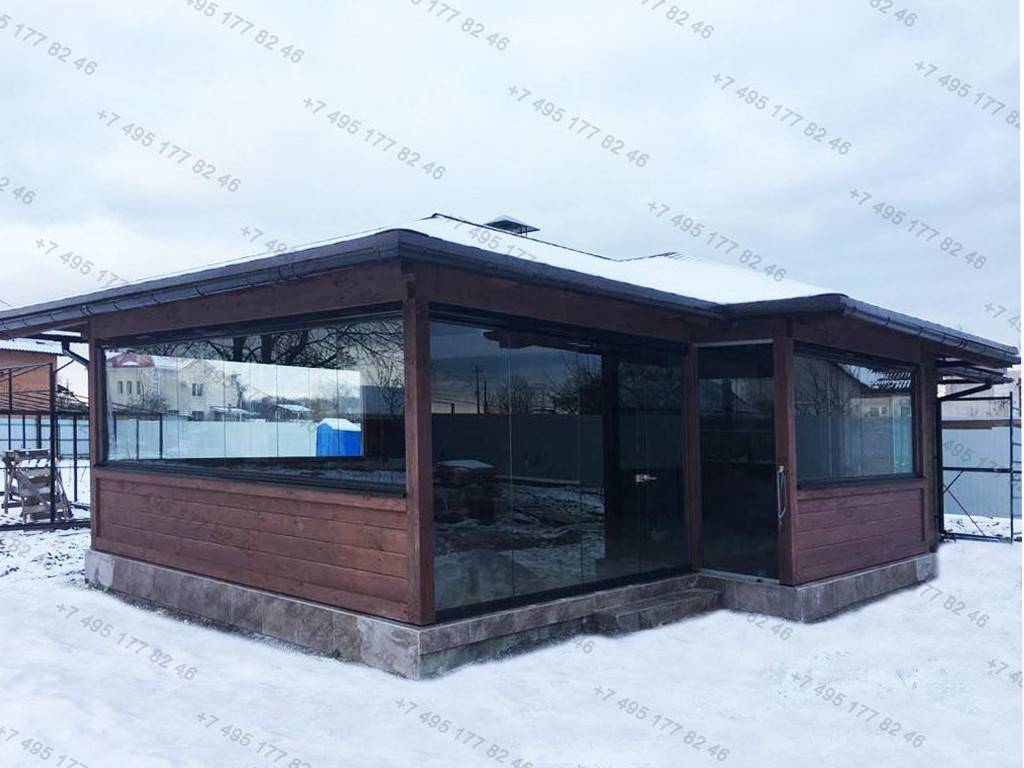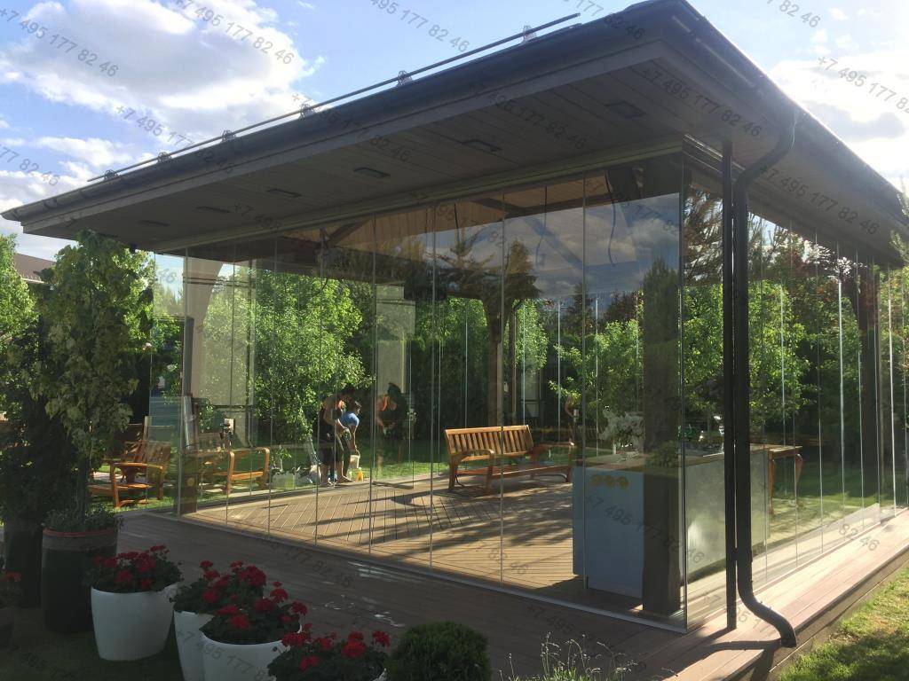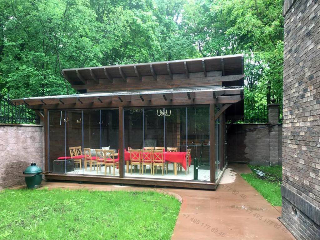 Площадь беседки 60 кв м. Клееный брус, фальцевая кровля изнутри отделана планкеном. Стеклянные раздвижные стены Lumon можно убрать полностью, открыв пространство для выхода в сад. Зимой стеклянная стена защищает мебель и оборудование от снега.