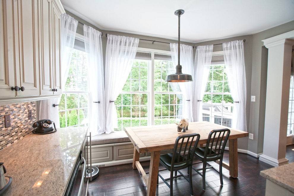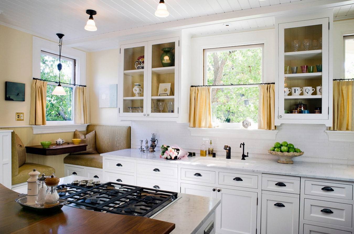 На фото интерьер кухни и короткие тюлевые гардины на окнах.