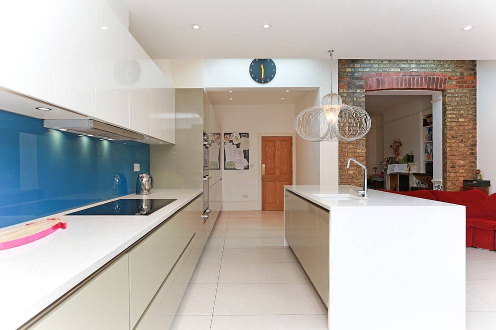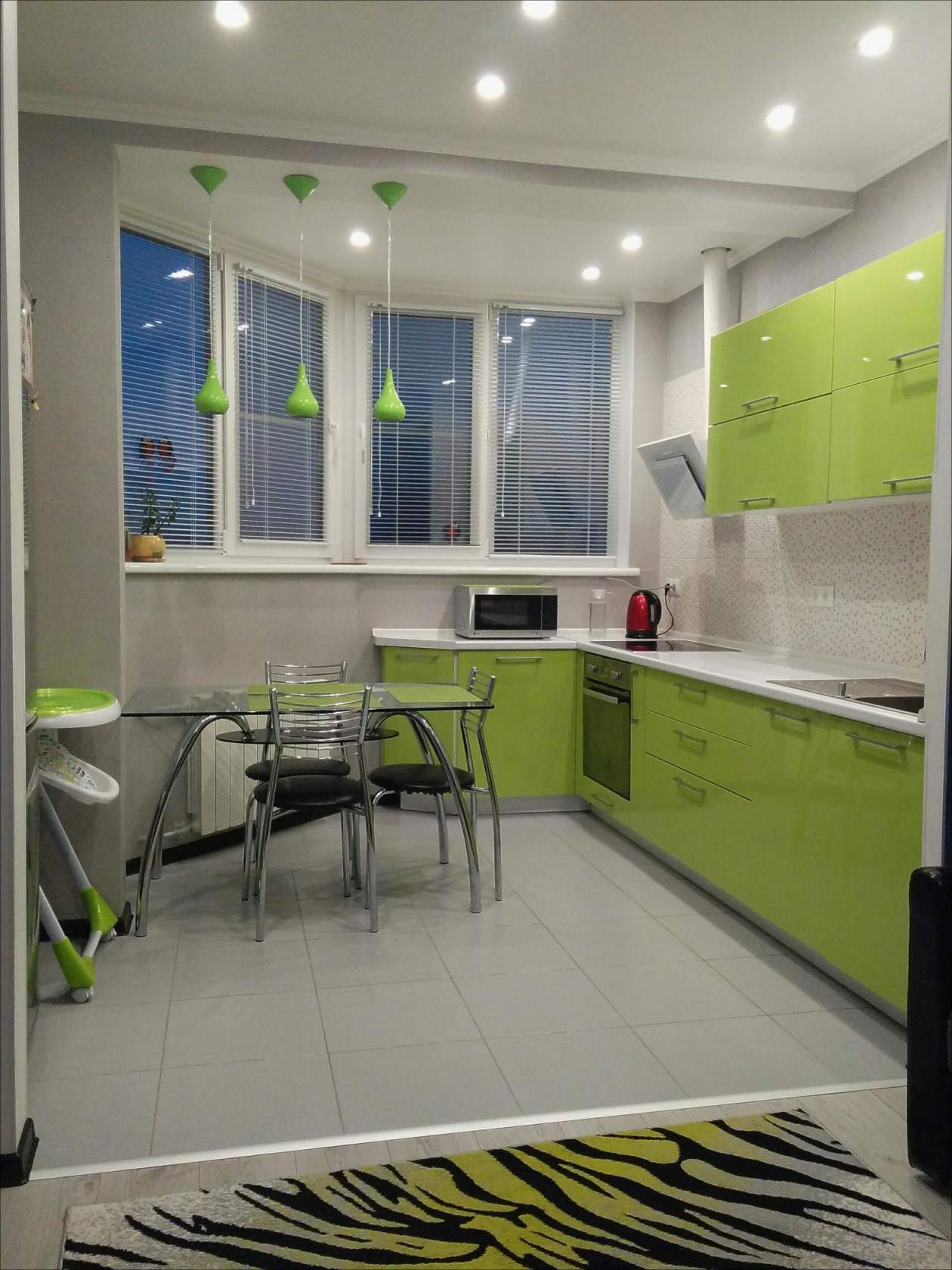 - потолок, пол, столешница должны быть выполнены в нейтральных цветах, например, белом, сером или бежевом. Яркость допустима лишь в немногочисленных аксессуарах. Стоит следить и за сочетаемостью цветов. С зеленым отлично смотрятся желтый, красный, оранжевый, синий, коричневый и иногда черный. Но последними двумя не стоит злоупотреблять.