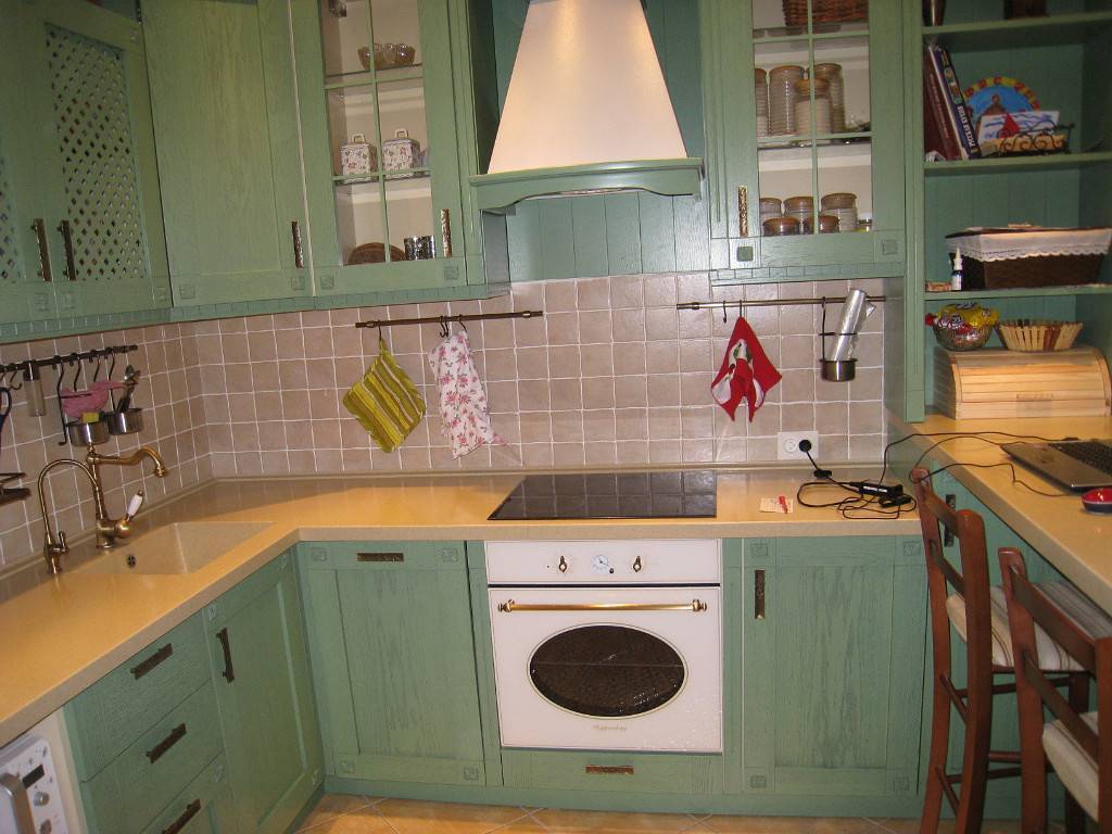 Роспись на колпаке вытяжки, на стенах несколько натюрмортов в зелёной гамме, в рамах с белыми паспарту. Белая и зелёная керамика завершат образ кухни в стиле прованс.
