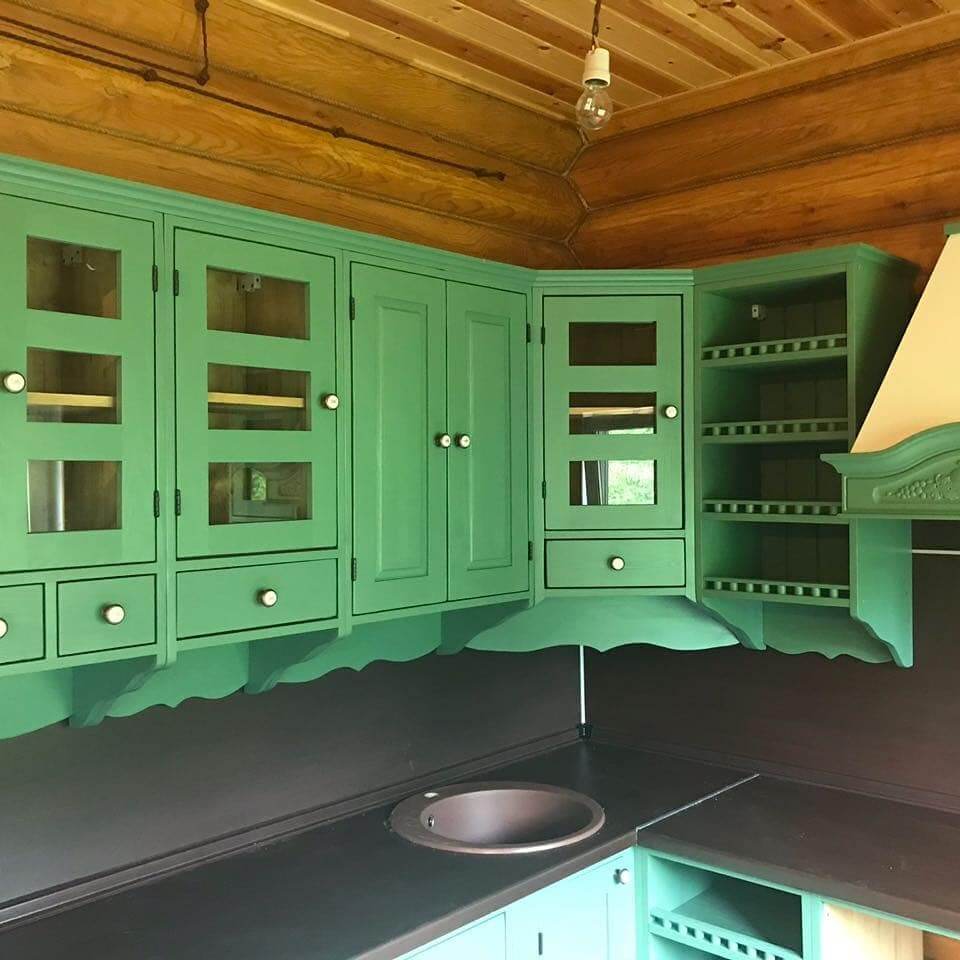 Пропорция белого зависит от освещённости. На северной стороне верхний ряд шкафов светлый. В кухне, выходящей окнами на юго-восток, зелёный может доминировать. Светлый – матовых, пастельных оттенков. Тёмный ближе к изумрудному, сложный и насыщенный. В классический интерьер впишется старый стол с гнутыми ножками. Выбор цвета зависит от вкуса хозяев.