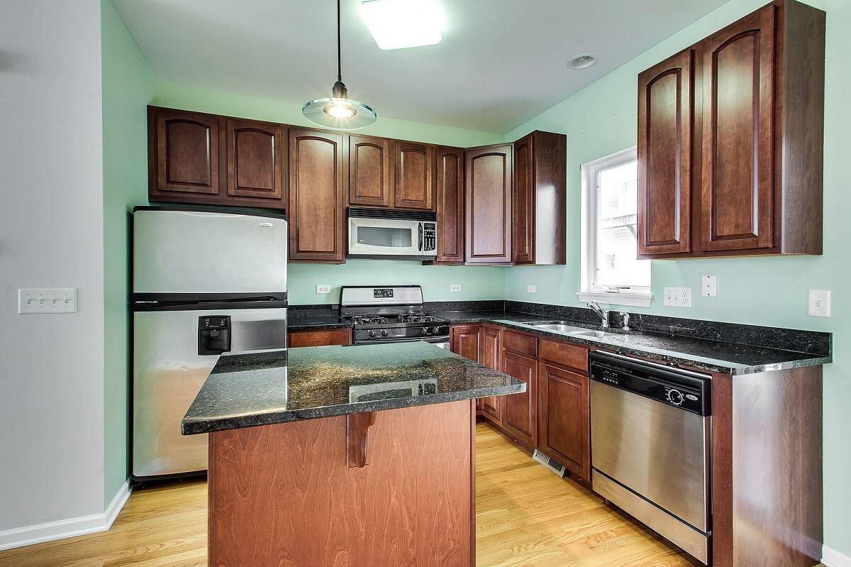 Неплохо вливается в зеленые гарнитуры бытовая техника с черными фасадами. Подобная палитра позволяет реализовать динамичность пространства и жизнерадостное настроение.