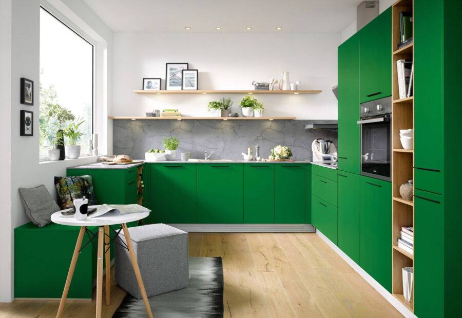 В коллекциях производителей кухонной мебели, задающих модные направления, зёлёный сочетается с натуральным деревом, белым и цветом металлик. Он представлен во всех стилистических направлениях.