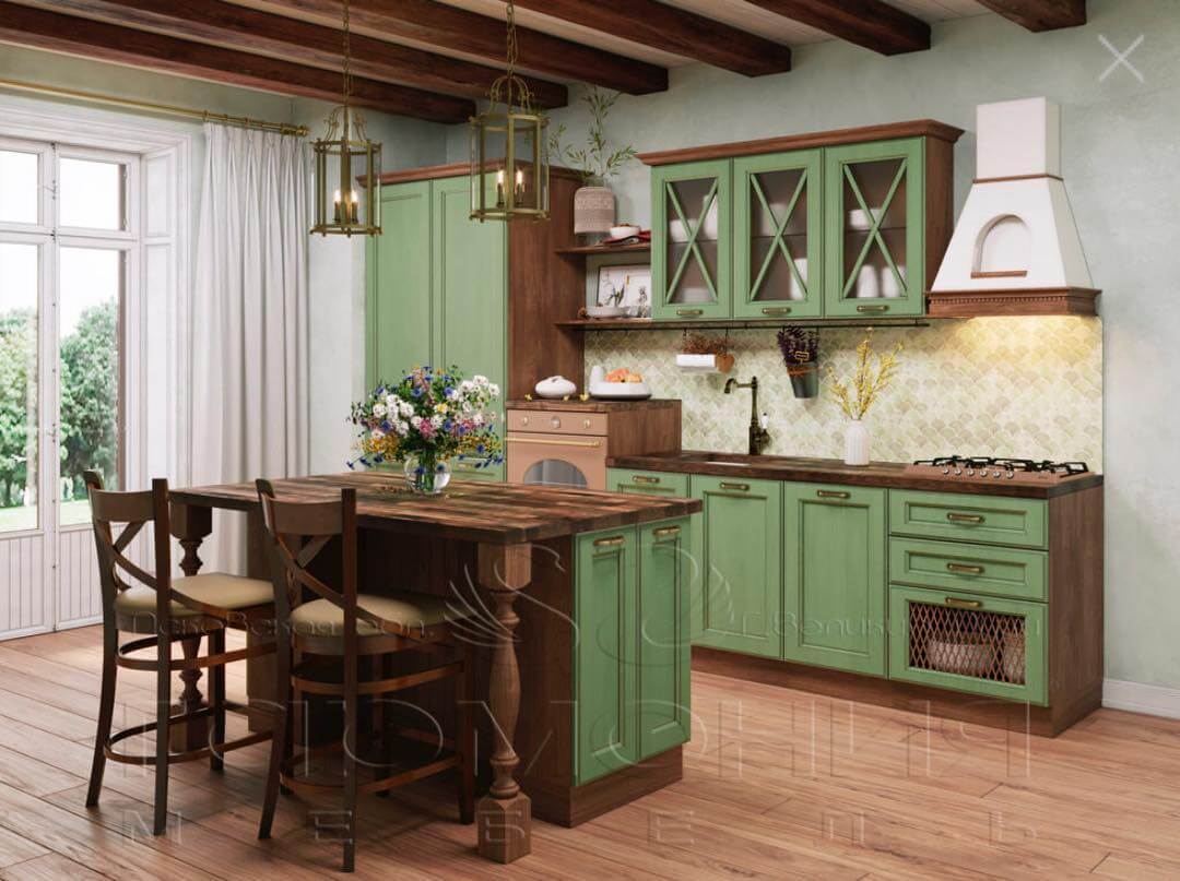 Фото сочетания дерева с мягко-зеленым в интерьере кухни – идеальный вариант для французского кантри.
