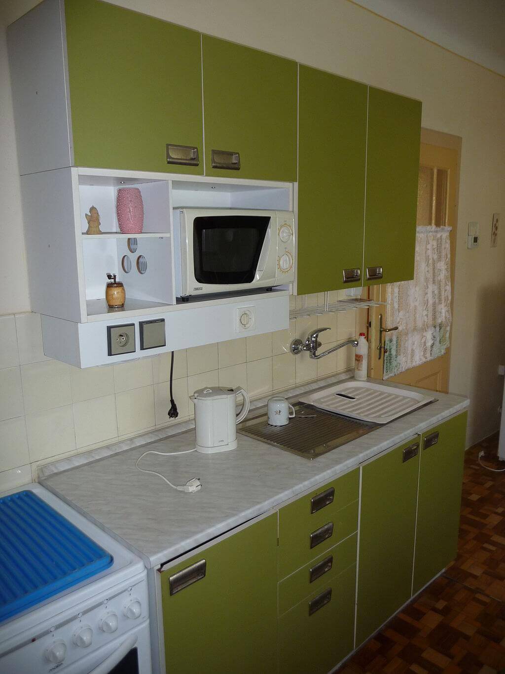 мебель для кухни выполняется из ДСП и древесины. Фасады шкафов имеют покрытие из прочной ПВХ плёнки, которую легко мыть