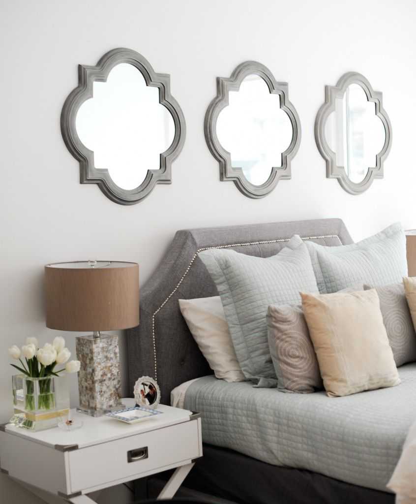 Зеркало, что вешается в изголовье ложа, будет нести лишь декоративную функцию. Оно не дополнит помещение оригинальными оттенками или цветовыми решениями, главную роль здесь сыграет его форма – в виде панно, к примеру. Верно выбранные эти 3 элемента помогут вам освежить даже очень скучное помещение.