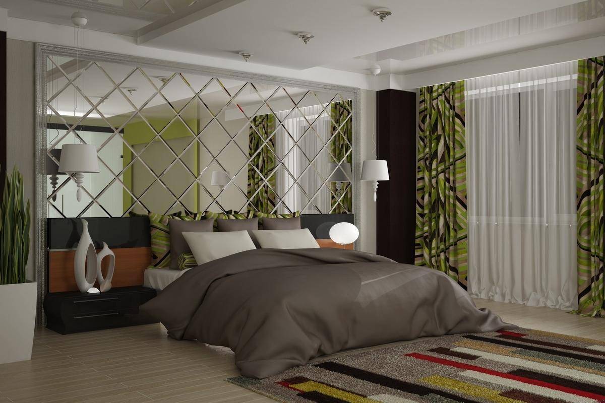 Это довольно популярный вариант установки зеркала. Так, выбирают и размещают по периметру стены либо несколько небольших зеркал, либо одно большое – для установки над кроватью.