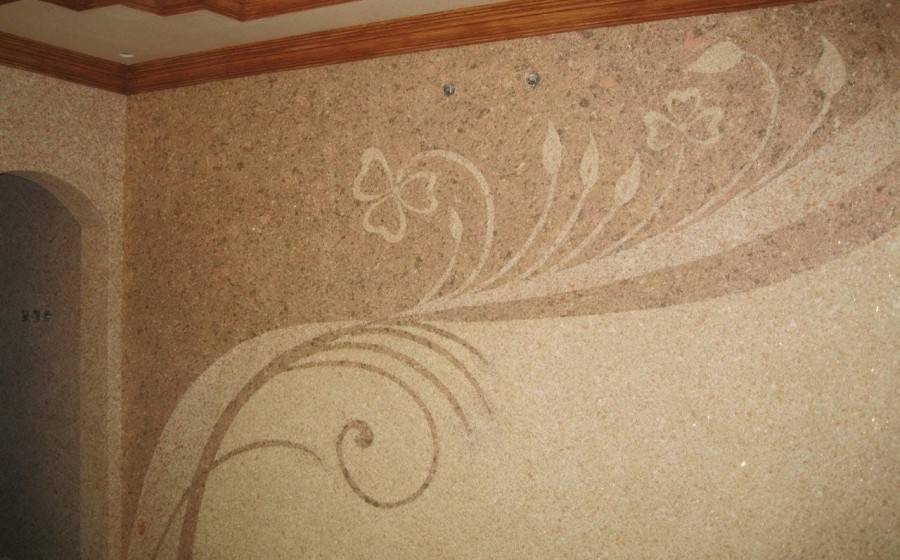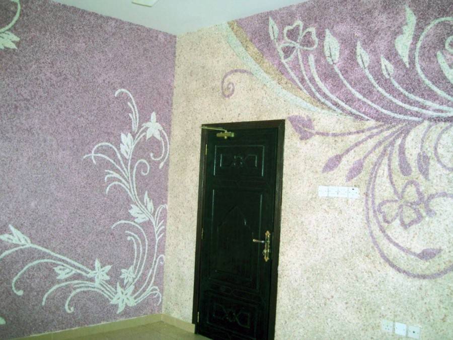- Неповторимый декоративный эффект получается при добавлении различных наполнителей. А при помощи трафаретов на стенах можно создавать узоры, орнаменты и даже картины.