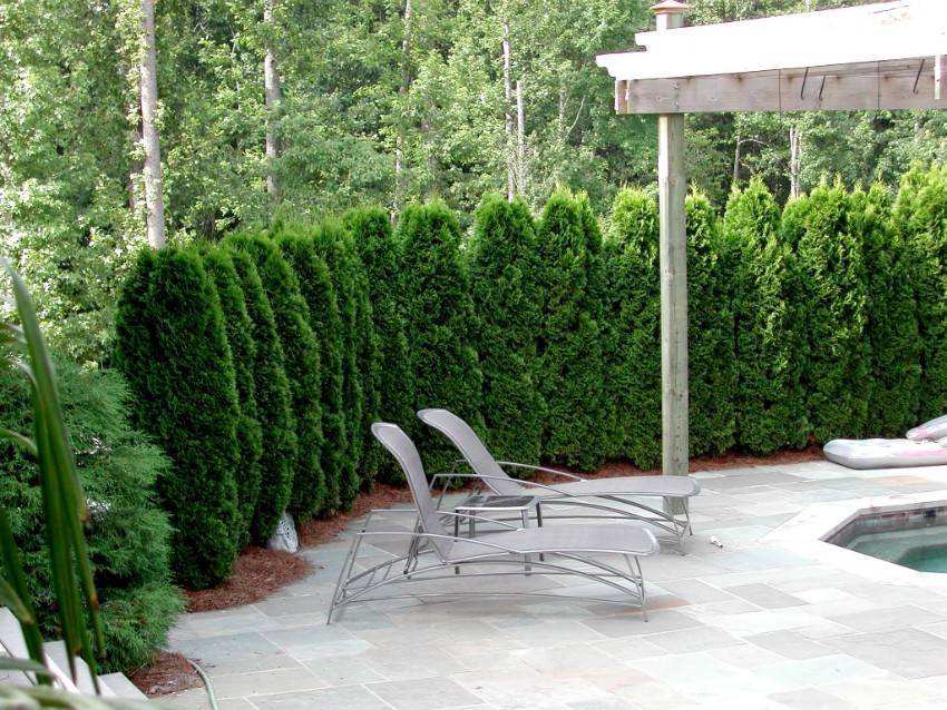 С помощью живой изгороди из хвойных деревьев можно красиво зонировать дачу и создать затененные участки для отдыха.