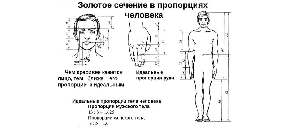 Пропорции различных частей нашего тела составляют число, очень близкое к золотому сечению. Если эти пропорции совпадают с формулой золотого сечения, то внешность или тело человека считается идеально сложенными. Принцип расчета золотой меры на теле человека можно изобразить в виде схемы:
